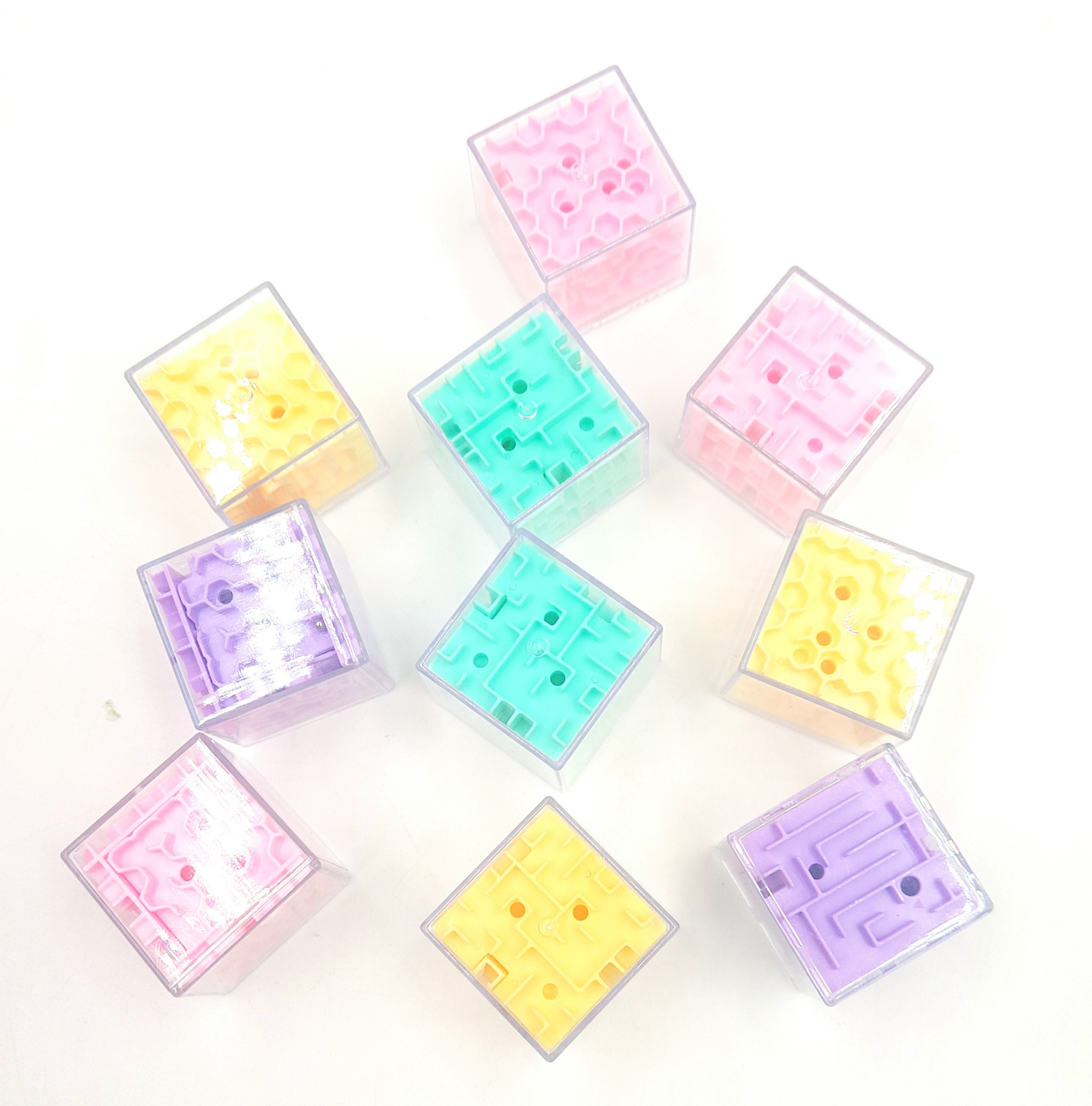 Gry zręcznościowe kostki pastel to pakiet 10 sztuk oryginalnych gier w pastelowych kolorach. Każda ze ścianek zawiera labirynt przez, który należy poruszać się do celu metalową kuleczką. To świetny trening cierpliwości!